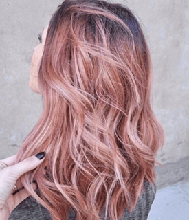 Sometimes making a statement with rose gold hair can be as easy as rocking a whisper of color. At your haircolor consultation, ask your stylist about using a balayage technique starting near the root for soft bursts of rose gold throughout the hair. Blasting hair with texturizing hairspray can also help give it a windswept effect helping haircolor shine through.