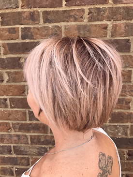 Pink streaks throughout the hair help take this platinum blonde to the next level. Adding rose gold blonde touches to the hair are a perfect way to add some flair to a traditional bob. To add piece-y separation and show off layers of haircolor, style hair using hair paste.