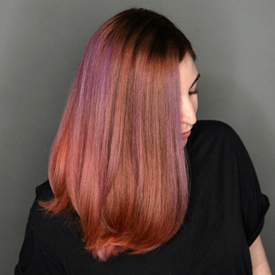 Recréez les effets d’un coucher de soleil dans votre chevelure avec les nuances traditionnelles de rouge, de Rose Gold et de violet. Pour donner vie à ce look, demandez à votre coloriste des racines sombres sur le dessus, qui s'éclaircissent en un ombré Rose Gold. Une coiffure aux racines sombres vous accordera plus de flexibilité quant à l'entretien de la couleur lors de la repousse des cheveux. Pour des cheveux lisses qui reflètent parfaitement la lumière et l'effet coucher de soleil, utilisez le traitement Glow Dry**, un produit idéal pour obtenir une chevelure très soyeuse.